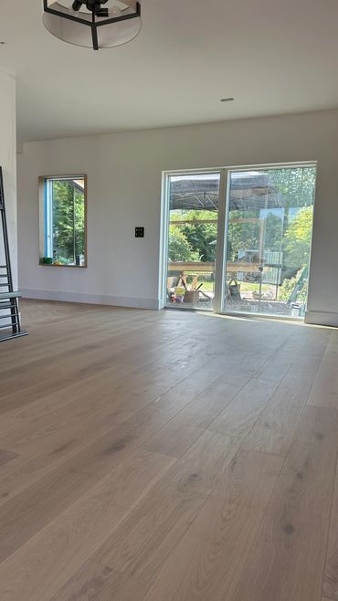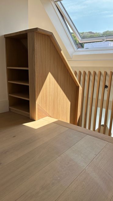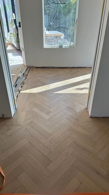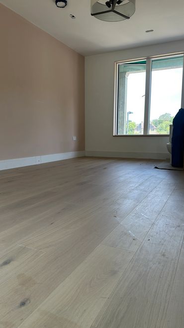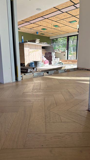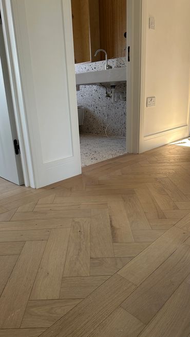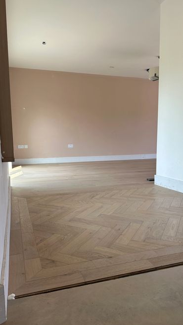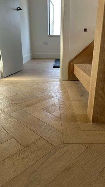 We installed Woodpecker Harlech Ecru Oak in a straight plank finish across four bedrooms, the lounge, and a loft room. For the landing and entrance lobby, we used Woodpecker Goodrich Ecru Oak laid in a classic herringbone pattern with a two-plank border to frame the space beautifully.