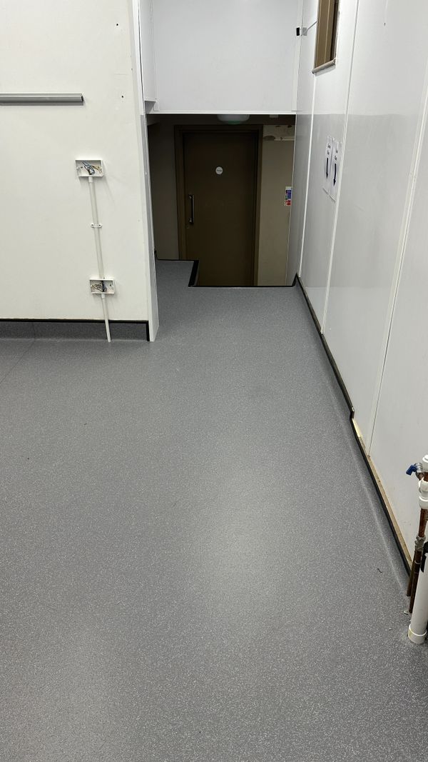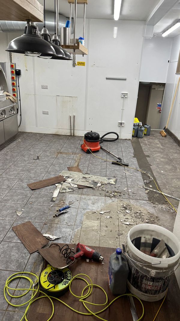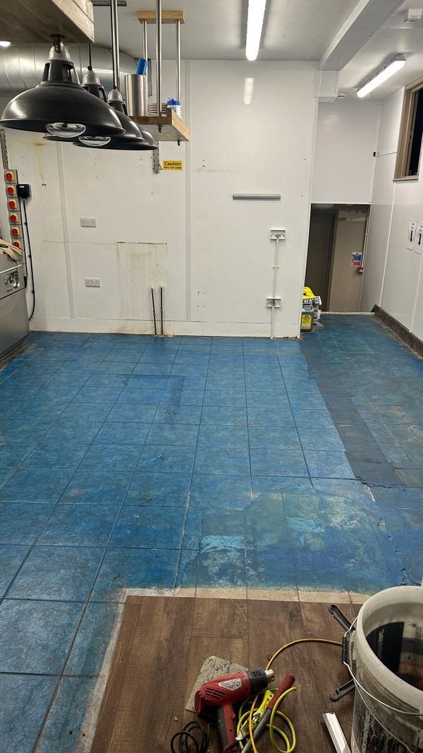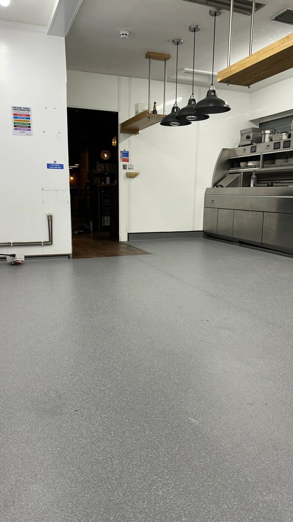 In the kitchen and prep areas, we fitted 35m² of Altro Stronghold K30 safety flooring, providing maximum slip resistance, hygiene performance, and long-term durability in a busy commercial environment.